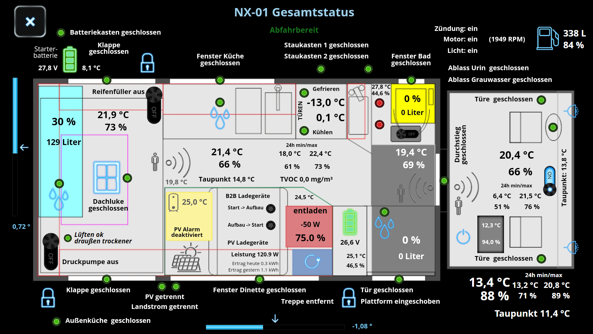 Wozu diese Informationen gut sind? Sie erlauben mir z. B. die Frischwasserpumpe auszuschalten, sobald der Motor gestartet wird. Dadurch wird ein Desaster vermieden, wenn sich beispielsweise durch Vibrationen eine Schlauchverbindung lösen sollte. Auch kann ich die Abluft unserer Trockentrenntoilette auf maximal stellen, um zu vermeiden, dass durch den Fahrtwind das “Odeur” in den Innenraum gedrückt wird. Und ganz nebenbei kann eine SMS, dass in Abwesenheit der Motor gestartet wurde, auch ganz informativ sein…